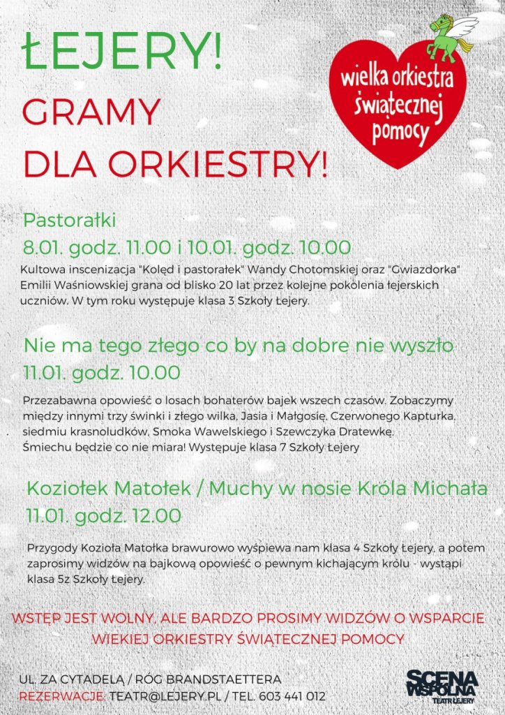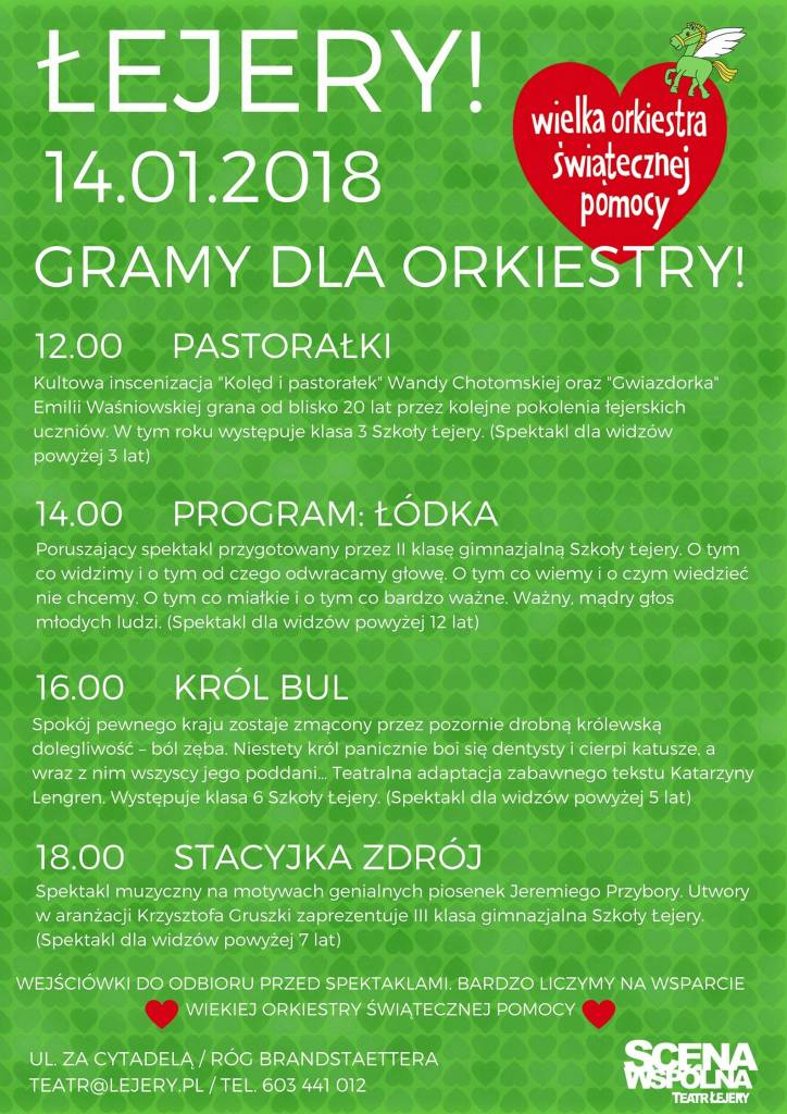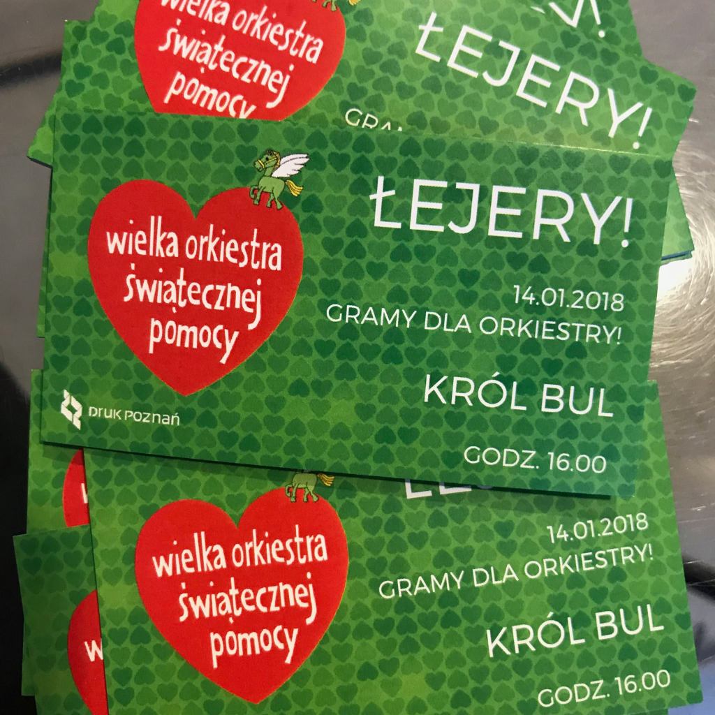 Nasz coroczny udział w Wielkiej Orkiestrze Świątecznej Pomocy zaczął się w styczniu 1992 roku, a więc 29 lat temu. Pamiętam jak dziś salę marmurową w Zamku, w której znajdował się poznański sztab WOŚP. Z niej Poznań łączył się z Warszawą. Miałem zaszczyt rozmawiać wtedy z Jurkiem Owsiakiem. Przez te lata wielokrotnie Łejery grały i śpiewały w różnych miejscach Poznania: w Zamku, na Malcie, na Targach, czy pod Okrąglakiemi… i wrzucały do skarbonek złotóweczki ze swojej skarboneczki.