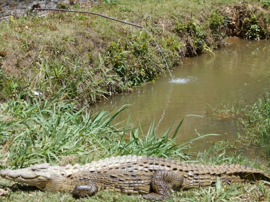 Po dwóch godzinach podróży przystanek na Crocodile Farm. No cóż, krokodyle reprezentuje tu jedna bardzo leniwa krokodylica, która przez piętnaście minut prezentowała tylko kawałek pyska i dopiero po wielu nawoływaniach naszego przewodnika raczyła bardzo dostojnie się wynurzyć, a potem uwaliła się na brzegu i już nie reagowała na żadne zaczepki. Madagaskar nie miał nigdy lwów, tygrysów, lampartów, ale były tu krokodyle. Kiedyś były one prawdziwą zmorą Madagaskaru. W porze deszczowej, gdy powodzie dosięgały wiosek, żerowały bezkarnie wśród chałup, porywając zwierzęta domowe i dzieci. Obliczano, że rocznie padało ich ofiarą kilkaset ludzi, głównie kobiet czerpiących wodę. Trudno było je zwalczyć, gdyż Malgasze wierzyli, że żyją w nich dusze przodków i oddawano im religijną cześć. Jednak po drugiej wojnie światowej, gdy ludzie w Europie i Ameryce zwariowali na punkcie krokodylich skór, ceny na nie poskoczyły wielokrotnie. Skończyła się świętość i bezkarność krokodyli. W ciągu kilku lat wybito je niemal doszczętnie. Obecnie występują już prawie wyłącznie w parkach narodowych. Tej naszej krokodylicy nie chce się nawet nas postraszyć.