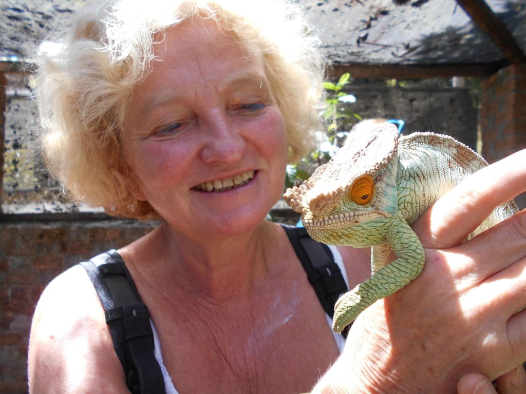 Za to kameleony chętnie nawiązują kontakty. Nasz przewodnik twierdzi, że wcale nie zmieniają koloru pod wpływem otoczenia, tylko na skutek różnych emocji: strachu, złości czy radości. My w każdym razie żadnych emocji w nich nie wywołujemy, bo pozostają przy swoich ubarwieniach.