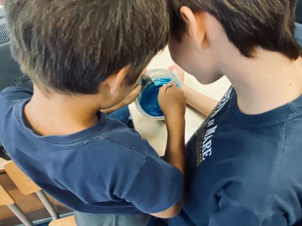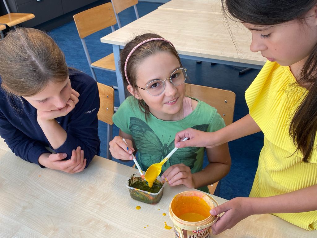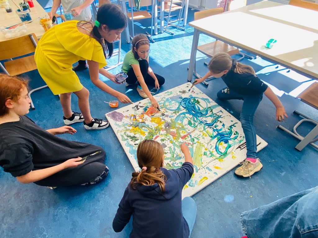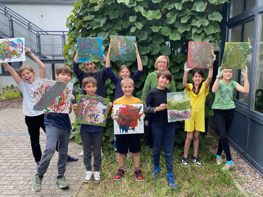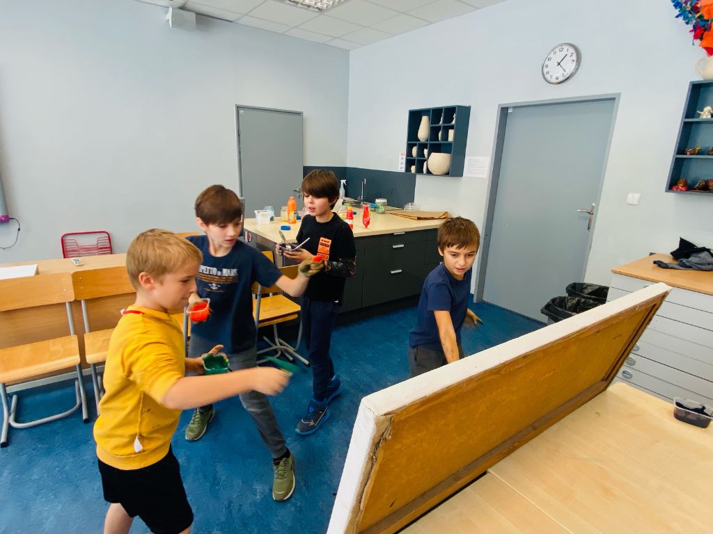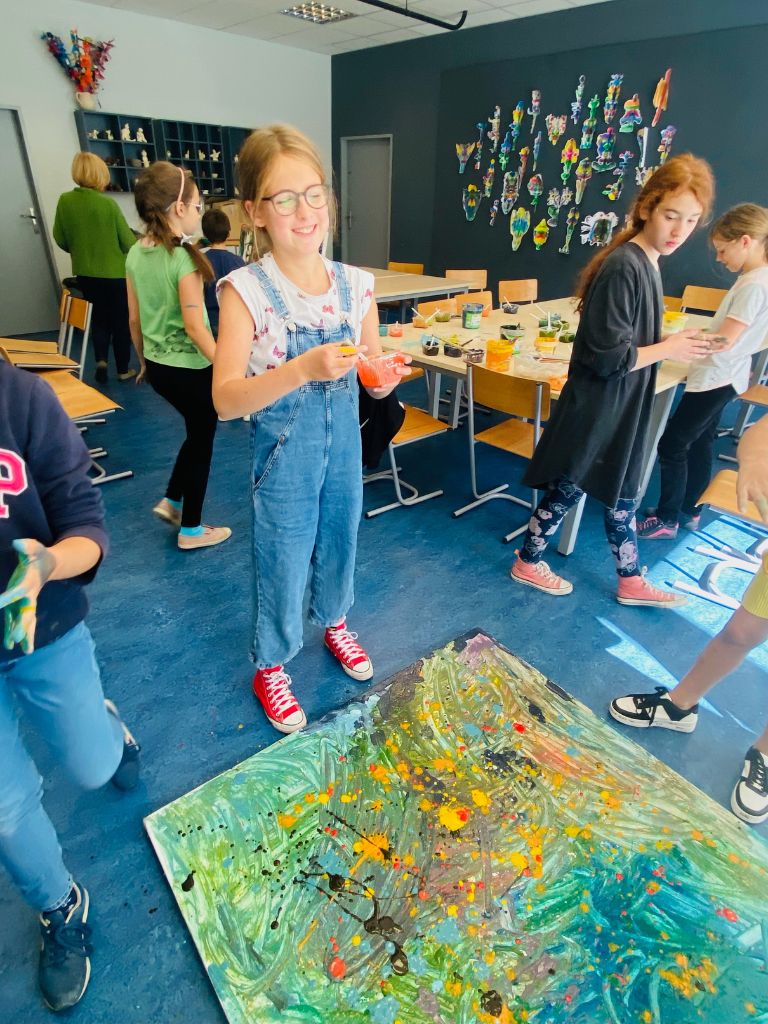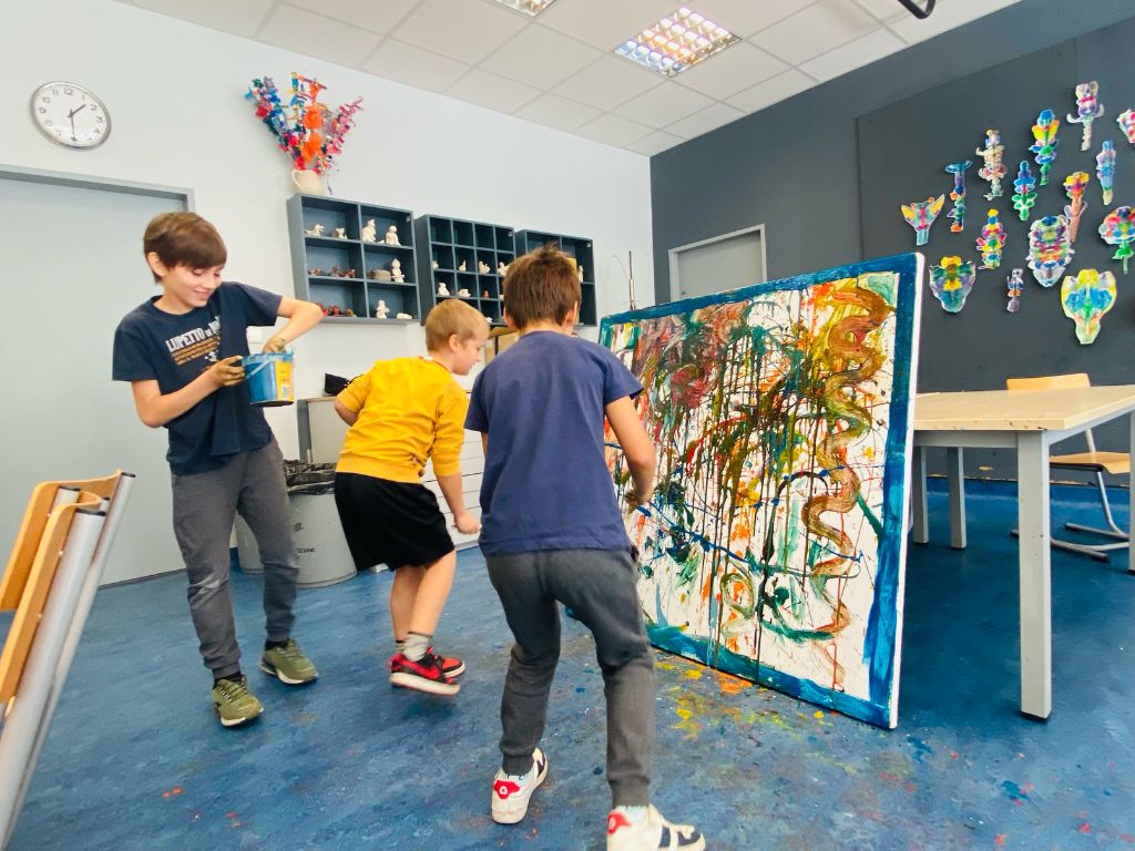 Grupa Czwartaków i Piątaków wzięła udział w warsztacie malarskim: sami robiliśmy farby, mieszaliśmy, chlapaliśmy… Udało nam się nawet zatrudnić grawitację do tworzenia obrazów!