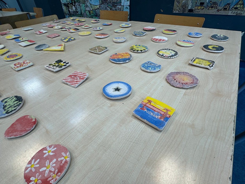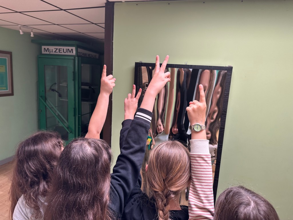 Piątek to dzień podsumowań i pożegnań. Spotkaliśmy się w kręgu, aby porozmawiać o tym co sprawiło nam najwięcej frajdy podczas tych kilku wspólnych dni i co chcielibyśmy ulepszyć. Ostatnie wspólne chwile przed odjazdem gości to czas na upominki, przytulasy i… odkrycie krzywych zwierciadeł w holu szkoły 🙂