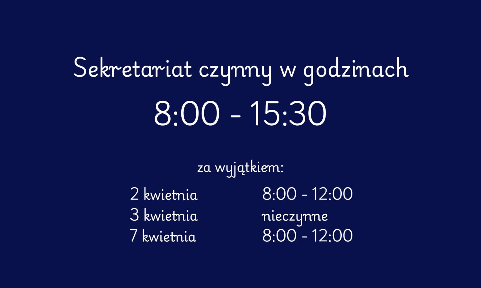 Godziny otwarcia SEKRETARIATU Opublikowane przezŁejery30 Mar 202630 Mar 2026Opublikowany w2025/2026, Bez kategorii Sekretariat czynny codziennie od poniedziałku do piątku w godzinach 8:00 – 15:30 za wyjątkiem: 2 kwietnia 2026 8:00 – 12:00 3 kwietnia 2026 NIECZYNNE 7 kwietnia 2026 8:00 – 12:00 Powiązane